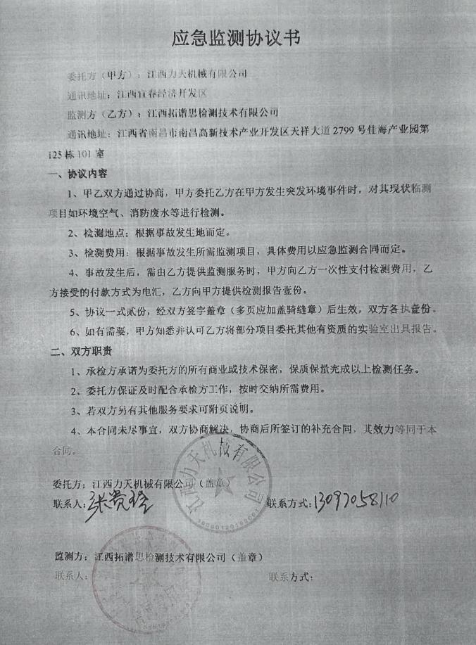 (2)江西力天機械有限公司外部救援機構為政府職能部門及周邊企業(yè),一旦發(fā)生突發(fā)環(huán)境事件,通過信息傳遞需要實施外部救援時,相關部門及單位本著“以人為本,快速響應”的原則,能迅速對本企業(yè)進行應急救援。